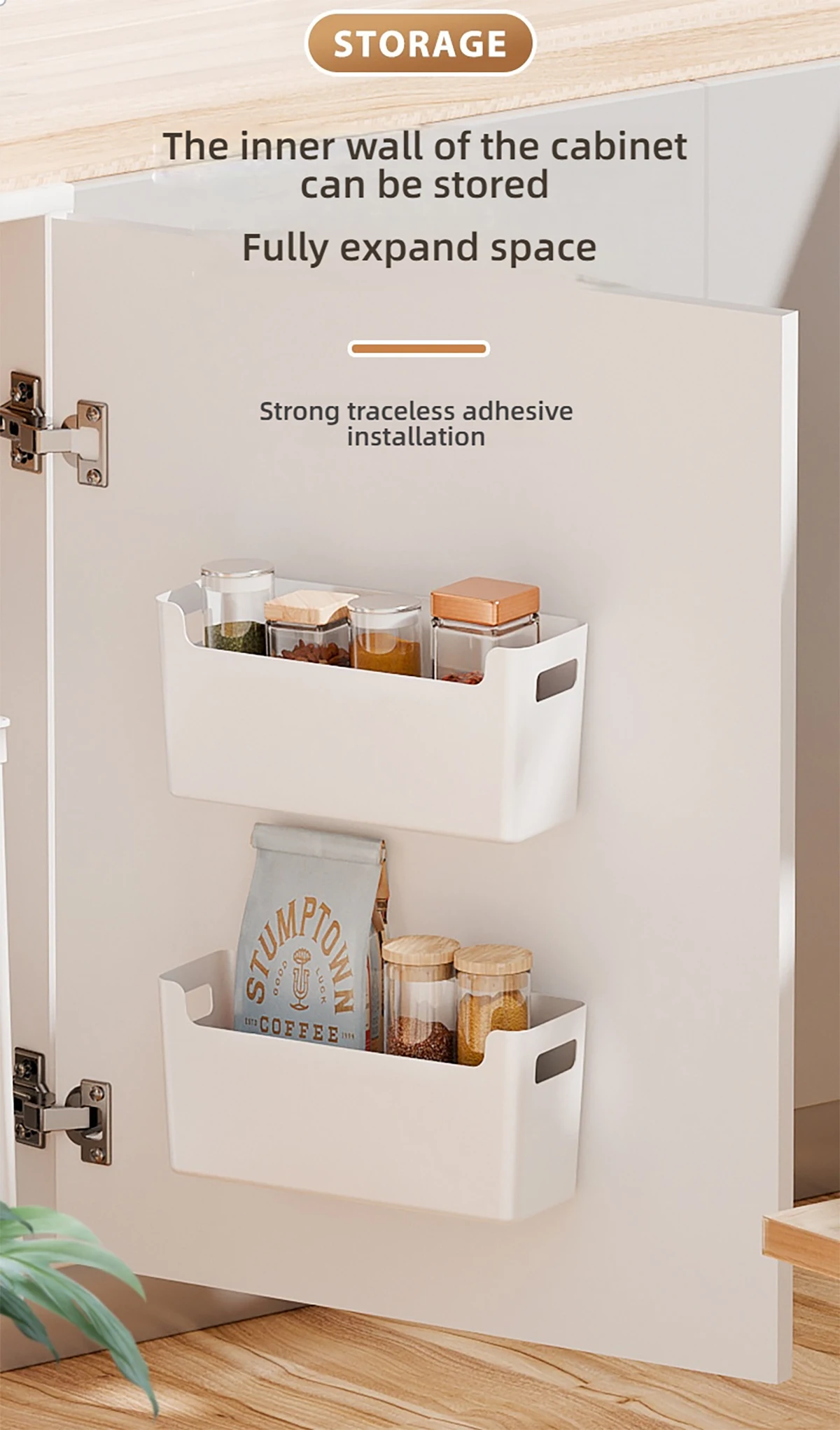 Minimalist White PP Wall-Mounted Storage Box - Self-Adhesive Cabinet Door Organizer for Kitchen, Space Saving Design (No Tools)